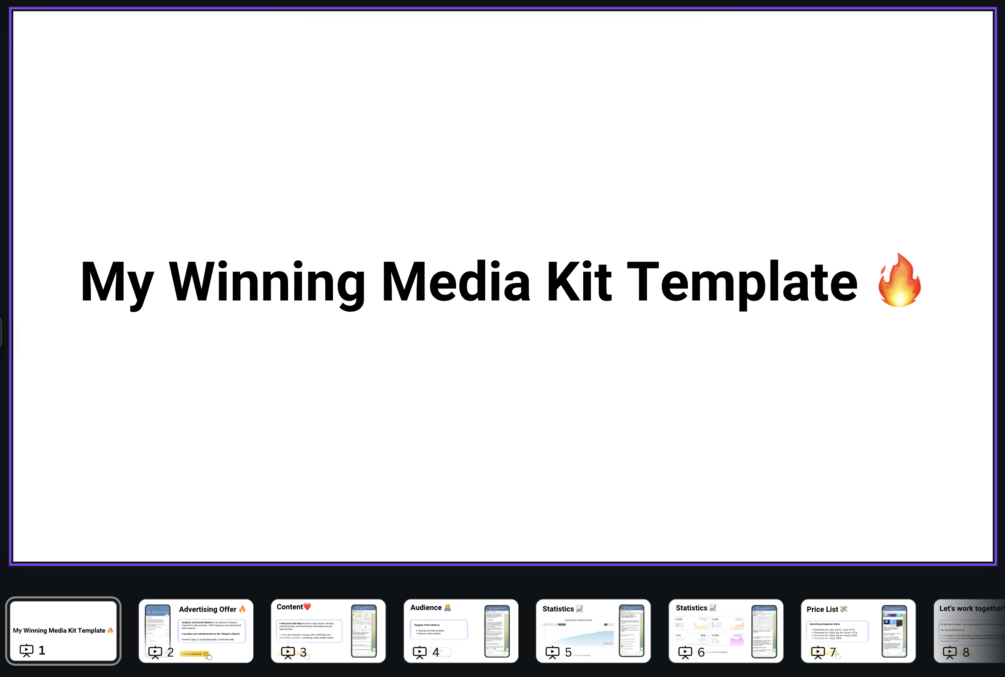 Media Kit Template – A ready-to-use canvas that helps you pitch your Telegram channel like a pro. Includes a real example that brought in high-paying sponsors. Use it to showcase your stats, pricing, and audience, then send it directly to potential clients with confidence.